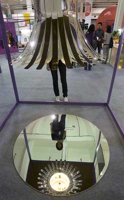 “視覺(jué)電壓”是世界環(huán)保設(shè)計(jì)趨勢(shì)下的產(chǎn)物,誕生于北歐創(chuàng)意之都瑞典,通過(guò)設(shè)計(jì)使產(chǎn)品的形態(tài)根據(jù)使用過(guò)程而改變,在滿(mǎn)足產(chǎn)品的環(huán)保、使用便捷等功能之余,為使用者帶來(lái)獨(dú)特的視覺(jué)感官體驗(yàn)。記者在展覽現(xiàn)場(chǎng)看到,曾獲得美國(guó)《時(shí)代雜志》“最具創(chuàng)意獎(jiǎng)”的節(jié)能燈具“花瓣燈”也來(lái)到了現(xiàn)場(chǎng)。這盞花瓣燈時(shí)而展開(kāi),將片片花瓣綻放,宛如一張“笑臉”,時(shí)而閉合,變成一個(gè)直筒造型。瑞典設(shè)計(jì)師介紹,這盞燈被安裝在室內(nèi),可以提醒人們注意節(jié)能,“首先設(shè)定一個(gè)能耗標(biāo)準(zhǔn),當(dāng)室內(nèi)各種電器的能耗超過(guò)這個(gè)標(biāo)準(zhǔn)時(shí),花瓣燈就會(huì)閉合;反之,它會(huì)給你一個(gè)燦爛的微笑。日常生活中,誰(shuí)不愿意天天面對(duì)著盛開(kāi)的花朵呢?”