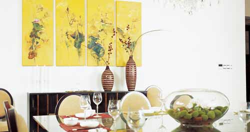 餐廳的墻面加以黃色的組畫裝飾不僅能增添用餐食欲,而且也讓空間富有暖意