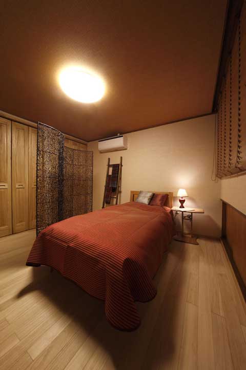大大的暖色調(diào)臥室,腥紅色家居軟品。地板采用柔軟舒適的桐木地板,天花鋪貼木絹壁紙,紋理特別。床的一旁是藤制的屏風(fēng),若隱若現(xiàn)的感覺,充滿神秘感,相當(dāng)有情調(diào)呢。