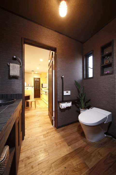 衛(wèi)生間里采用墻紙鋪貼有點像樹木表皮的感覺,配上綠色植物,讓人有種置身于熱帶雨林的錯覺,這種風(fēng)格非常純樸,當(dāng)之森林系家居!