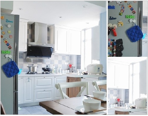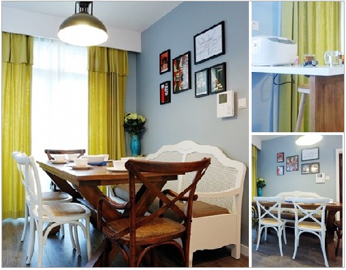 餐廳里兩種色調(diào)的餐桌椅,田園風(fēng)中略帶現(xiàn)代感。桌面上清新動人的半透明海白色玻璃餐具,是整個空間不可缺少的裝飾亮點,用它們來承載關(guān)于地中海的浪漫情懷。