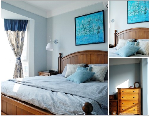 房間用色干凈、明快,藍色、白色以及原木本色、碎花點綴,有著田園的閑適,地中海的蔚藍。整個室內(nèi)房間采光很好,空間顯得大而通透。