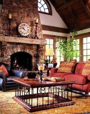 高聳的斜屋頂讓青石粗樸壁爐得以充分展現(xiàn),天花上的疊加木條呼應(yīng)了落地門窗,似乎在任何空間都與自然融為一體。美式沙發(fā)的寬大舒適讓會(huì)客或自娛自樂都了無障礙,沙發(fā)禁臟的面料和土黃印花的大幅地毯,在無限舒適的前提下又免除了清潔的繁瑣。