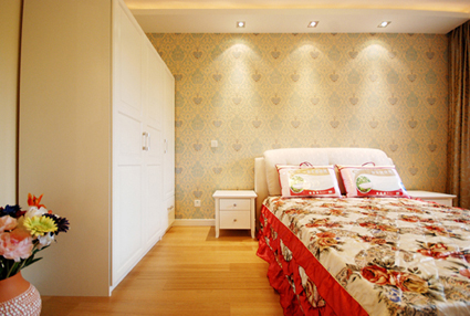 暖暖的臥室里,田園風格得以體現,簡潔諾大的衣柜可以有序的擺放任何衣物。