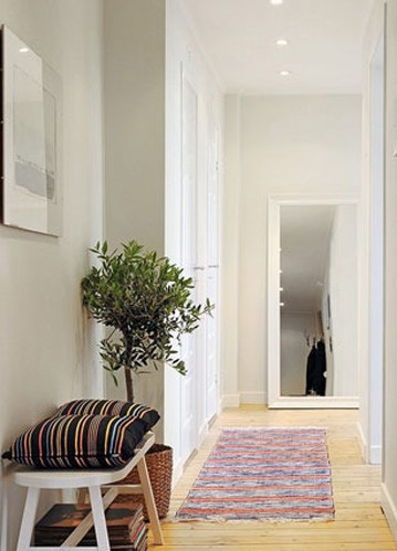 進(jìn)入眼簾的是玄關(guān)過道處,滿目的白色。白色的墻面提亮了走道的光感,而原木色的地板則又加入自然純樸的感覺。這樣的空間不會(huì)讓人覺得太冷,搭配起來更有現(xiàn)代感。白色的墻面、白色的吊頂讓空間提以拉升,它的光感已經(jīng)解決了空間高度問題。