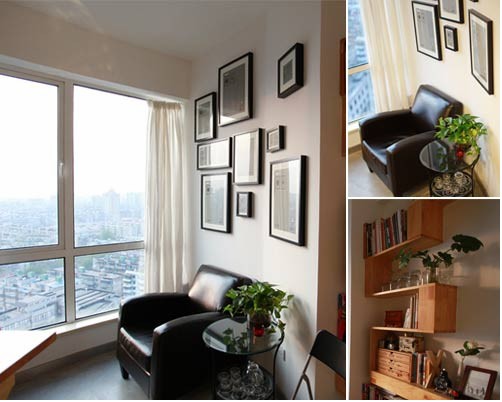 書房一側(cè)的休息處,大大的落地窗,開闊的視野。簡潔的黑色單人沙發(fā)以及背景墻面的照片裝飾,體現(xiàn)出簡約藝術(shù)的美感。原木色的純實木書架,放置的書籍與藝術(shù)裝飾并存。清新的植物盆栽,簡約清新亮麗美家。