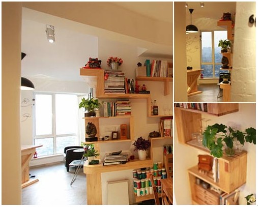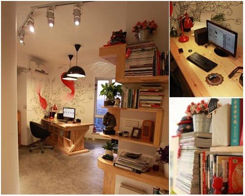 原木色的純實木書架上,錯落有致的擺放著各種各樣書籍與小裝飾品。最下層擺放著手繪必備的各色顏料。生命力旺盛的綠色小盆栽,紫色浪漫的勿忘**花,小清新與浪漫并存。