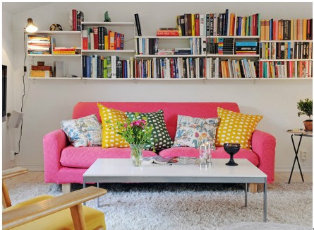 粉色的沙發(fā)、多彩的靠枕,相對豐富的色彩卻沒有妖嬈的氣息只有溫馨的舒適。背后的書籍是閑暇時的樂趣,厚實的毛絨地毯帶來和裝飾一樣舒心的踏實感。