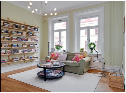米黃色的墻面比白色更多了那么一絲的溫暖,窗下的布藝沙發(fā)柔軟舒適。淺灰色的布套配以粉色的印花,北歐的簡潔風格中加點自己個性的小裝飾。墻面的層架上整齊的堆放書籍,午后在清新自然的小屋中讀本趣味盎然的書好好放松一下。