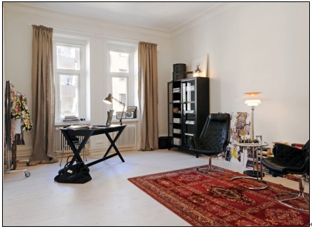 小巧的客廳同時具備書房的功能,但分區(qū)很明確。白白的房間簡單配以黑色的靠椅,舍棄笨重的沙發(fā),輕便的靠椅同樣能帶來沙發(fā)的功效。每一個細節(jié)的鋪成都呈現(xiàn)出令人舒適的感覺。