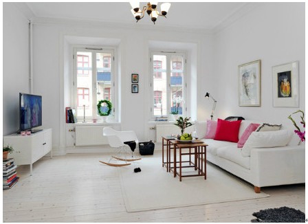 白色的沙發(fā)上擺放著紅與粉的靠枕格外耀眼,粉與紅色彩又淺到深逐漸變化,在大片白色的襯托下有著很強的活躍感。墻面上懸掛著大小不同的壁畫,使白色的墻面不會顯得單調。搖動靠椅的出現(xiàn)在小清新的生活中添加些一絲樂趣。