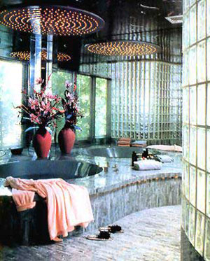 您是否也想象過自己能擁有一間如此豪華的浴室呢?玻璃鏡墻、滿天星式圓盤頂燈的選用,不僅拓展了空間,更增添了浴室的豪華氣派。其實,您也不妨試一下,并非要花費很多錢的。 (上海裝潢網(wǎng))