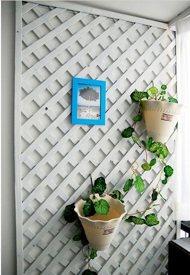 這塊玄關(guān)背景墻原來是防腐木色的,經(jīng)過設(shè)計(jì)的手把它噴上了白漆,這樣與玄關(guān)背景就很匹配啦,再用花架來填補(bǔ)單調(diào)的空白處。