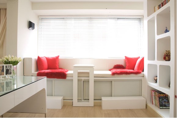 功能區(qū)規(guī)劃上,將與客廳相連的房間打通,用沙發(fā)作為隔斷,劃分出會(huì)客區(qū)及休閑閱讀多功能區(qū)??臻g暢通,也沒(méi)有影響使用功能。色彩上依然選擇紅與白的搭配。