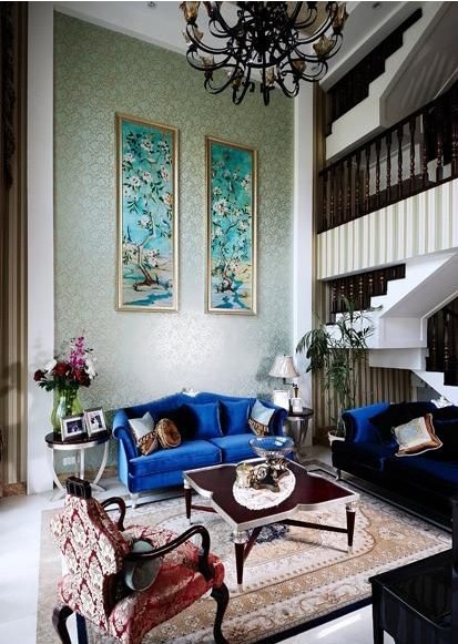 挑高的客廳是空間的最佳主角,繁復古優(yōu)美的吊燈傾瀉而下,在冷色調為主的空間里營造出溫暖的氛圍。豎紋線條的壁紙色彩清雅,增添了空間的立體動感,對立墻面上的兩幅油畫畫作則與之遙相呼應,構成活潑的空間動線。