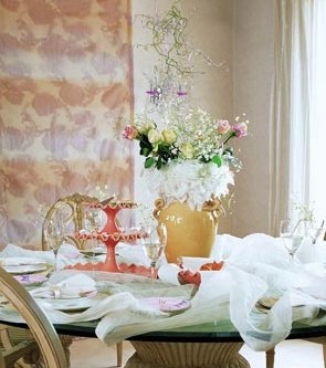 紗質(zhì)織物流淌于餐桌之上,同樣輕盈柔美的鮮花穿插其中;白色,米色,淡橘色彌散在整個用餐區(qū)內(nèi),輕盈與柔和的意味蕩漾在整個餐廳中……