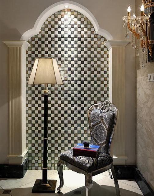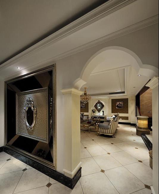 整個(gè)空間用圓拱柱式來代替了門的運(yùn)用,開闊了視野,拉伸了整個(gè)空間,更顯大氣。端景的設(shè)計(jì)很是精彩,和壁爐處的裝飾鏡有異曲同工之妙。