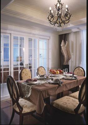 上述照明能突出餐桌,起到引人注目、增進(jìn)食欲的效果。為防止燈光照在人身上產(chǎn)生不良效果(下照光照在人頭頂上產(chǎn)生明暗不均,會破壞人臉部的形象),燈光應(yīng)限制在餐桌范圍內(nèi),人的臉部光線可通過壁燈或其他光源補(bǔ)充照明