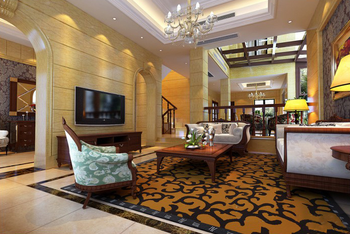 雅致的背景造型、考究的配飾、精湛的工藝,均是現(xiàn)代與古典相融的結(jié)晶,讓主人的審美情趣在優(yōu)美的線條、和諧的色調(diào)中自然流露。從玄關(guān)到客廳再到餐廳,空間流暢通明,名貴內(nèi)斂的淺調(diào)天然石料是地面和墻身的主材,石材與原木飾面墻壁形成鮮明而自然的對比。純凈的米色奠定了居室的基調(diào),放棄傳統(tǒng)歐式風(fēng)格中繁復(fù)的曲線與雕花后,明快的直線條勾勒出空間的清爽氣質(zhì)?!】蛷d的沙發(fā)背景運(yùn)用了西班牙米黃仿古石飾面中間用石材線條內(nèi)貼墻紙,墻紙中間掛上一幅藝術(shù)油畫,視覺效果既豐富又有立體感。一套大氣的組合歐式沙發(fā)配上實(shí)木的茶幾顯得主人家的品位。并彌漫出一份現(xiàn)代而古典的韻味。