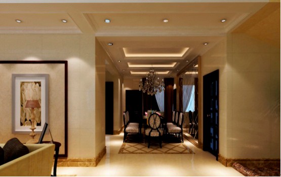 這是挑高的客廳,布置上是風水學里最招財?shù)?,明亮寬敞??蛷d是體現(xiàn)整個居家裝修最重要的位置。我們在方案處理上采用水晶的吊燈、拼花的地面、帶圖案的地毯以及帶紋樣的壁紙。這樣無一不散發(fā)出他的尊貴氣質(zhì)。米色系的大理石跟深色橡木的家私,組合成經(jīng)典的對比色系,既體現(xiàn)了家具的厚重、典雅,又不會讓空間感覺到過于沉重。墻面金鏡的運用以及精致工藝飾品的擺設,更加豐富了空間的層次,給人更加愉悅的視覺感受