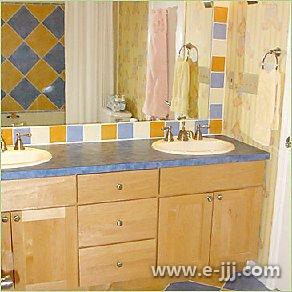 在一個(gè)中性的浴室內(nèi)可以增加浴室瓷磚的互補(bǔ)色,設(shè)計(jì)師Katie Leavy使用12×12的藍(lán)色和金色磚在地板和浴盆周圍鋪成斜紋,在鏡子周圍用4×4的瓷磚做成一個(gè)框架。