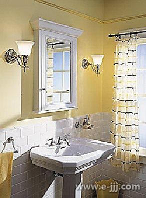 當(dāng)浴室的其它地方是豐富多彩的,考慮增加白色的對(duì)比配件,如這一傳統(tǒng)白色的小壁櫥。