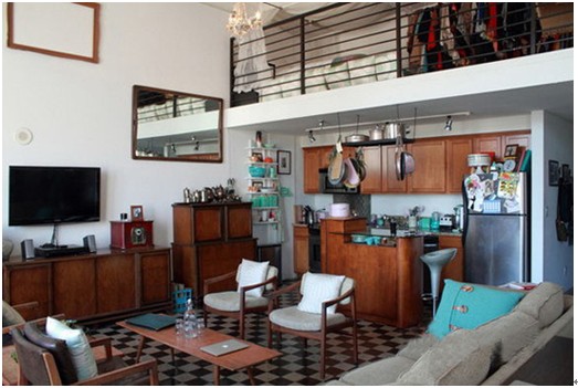 廚房貌似一個(gè)雜物間,雜七雜八的東西都放置在廚房間,特別是吊掛的鐵甲設(shè)計(jì),更像是修理庫(kù),把廚房區(qū)域設(shè)計(jì)的很獨(dú)特。另一頭白色的收納架擺放著各種色彩艷麗的廚房用具,讓暗沉空間變得亮堂一點(diǎn)。