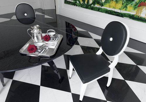 餐椅Audrey,白色上漆結(jié)構(gòu),黑白兩色真皮椅面和靠背,參考價(jià)格26500元。餐桌New York上擺放著同Rosenthal合作生產(chǎn)的餐具