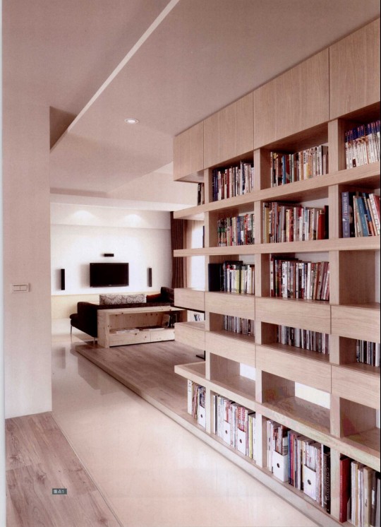開(kāi)放式的書(shū)房連接客廳,讓空間更顯開(kāi)闊。從書(shū)延伸至走道的L形大面書(shū)墻不僅有強(qiáng)大的收納功能,更成為空間視覺(jué)的焦點(diǎn),讓走道變身為屋主最流連的空間。