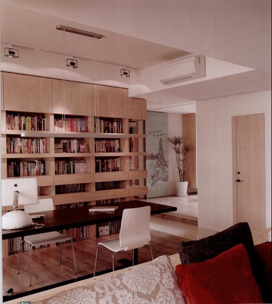 為滿足各種尺寸的書(shū)籍及CD片收納,設(shè)計(jì)以木作量身定制層板,并以門(mén)片變換柜體,豐富書(shū)墻的“功能”。