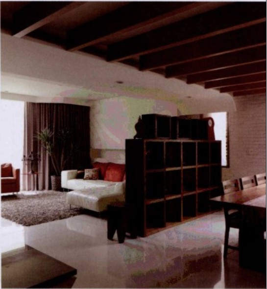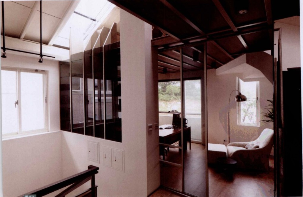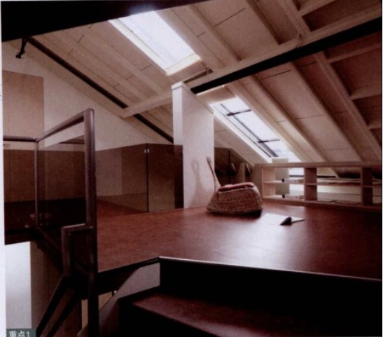 設(shè)計(jì)師運(yùn)用開(kāi)放式空間規(guī)劃,減少木作的使用,以突出挑高、無(wú)壓的空間優(yōu)勢(shì),并使用環(huán)何涂料及原木地板等環(huán)保建材,不只在于健康空間的營(yíng)造,也讓受閱讀的屋主所收藏的書籍有適當(dāng)?shù)氖占{空間。保留斜屋頂,將挑高的區(qū)域規(guī)劃為閣樓,充分采光的天窗及玻璃扶手隔屏連接書房,滿足了收費(fèi)也營(yíng)造了良好的閱讀氛圍。