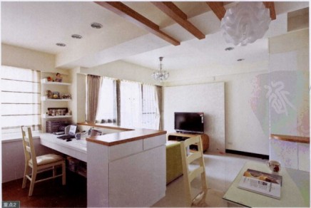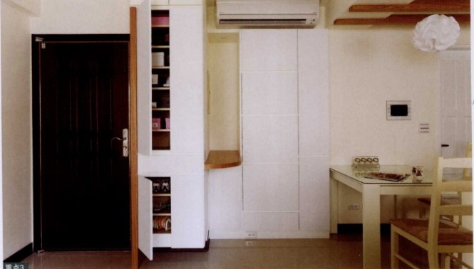 因為是小住宅,所以屋主對于把握空間的利用率更為在意,特別是收納功能的規(guī)劃很重視。除了收納空間的設計外,屋主對于空間風格也有自己的偏好,喜歡明亮、清爽又帶溫馨的空間質感。由于室內只有50平,除了主臥外,其他空間皆采用開放式設計。設計師順應空間特性規(guī)劃收納功能,從入門玄關鞋柜連接餐柜,到哪臺連接書桌等等,皆以復合式功能概念規(guī)劃,屋主最重視的書柜也以雙層設計達到雙倍收納,充分利用了空間。