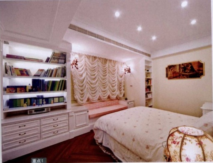 窗簾占空間視覺面積不小,所以窗簾的選擇也會影響空間氣圍及風(fēng)格。窗簾造型及材質(zhì)決定質(zhì)感,若想讓空間呈現(xiàn)浪漫夢幻的優(yōu)雅,應(yīng)選擇古典、多層次的窗簾。窗邊規(guī)劃休閑窗臺,連接旁邊的書柜,提升收納功能