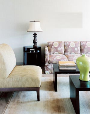 極致簡約而略嫌生硬的現(xiàn)代家具,會因布藝與飾物的裝點(diǎn)變得生動。造型上的方與圓,材質(zhì)上的棉與麻,色彩上的白與綠,看似不很和諧的元素,也能在巧妙的混搭中,呈現(xiàn)隨性的舒適感。