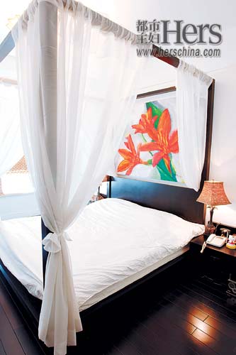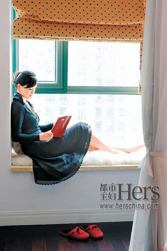 臥室同樣是清淡的純色夾雜著絢麗的點(diǎn)綴,黑色的床,白色的紗幔,窗臺上放著絨毛坐墊,冬天可以坐著曬太陽?!鞍咨嗎ご瓜?,好像這是屬于我的空間,沒有任何人可以走進(jìn)來。”在美國,她經(jīng)??醇揖友b修節(jié)目,學(xué)到了不少新鮮的點(diǎn)子,比如把米黃色的布掛在墻上代替墻紙,可以隨著自己的心意經(jīng)常更換,布的質(zhì)地柔軟、吸光,令房間充滿溫暖的感覺。