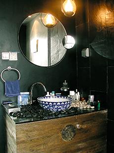 基調(diào)是一片蔚藍(lán),藍(lán)色的馬賽克、灰藍(lán)色的地磚。因?yàn)榭臻g相對(duì)較大,所以主人就有了很大的發(fā)揮余地,為洗衣機(jī)量身定做的小臺(tái),上面還可以放一些雜物,弧形的洗手池、手盆與同樣造型的整體浴房呼應(yīng)著,“整體浴房”其實(shí)是主人自己用磚砌出來(lái)然后貼上藍(lán)色馬賽克做成的。大面積使用馬賽克,并在頂部鋪上了溫暖的桑拿板,刻意做成的斜屋頂式燈箱是主要光源,設(shè)計(jì)的本意是希望給這個(gè)沒(méi)有一扇窗子的衛(wèi)生間,帶來(lái)一種有天窗的錯(cuò)覺。