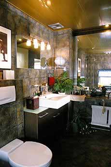 這個(gè)衛(wèi)生間的妙處當(dāng)然就是要你多一點(diǎn)頑皮之心了。不要拘泥什么定式,其實(shí)任何一種材料、任何一種裝飾品在設(shè)計(jì)伊始并沒(méi)有被規(guī)定必須做什么,只要展開想象,當(dāng)然就可以獨(dú)一無(wú)二、與眾不同。