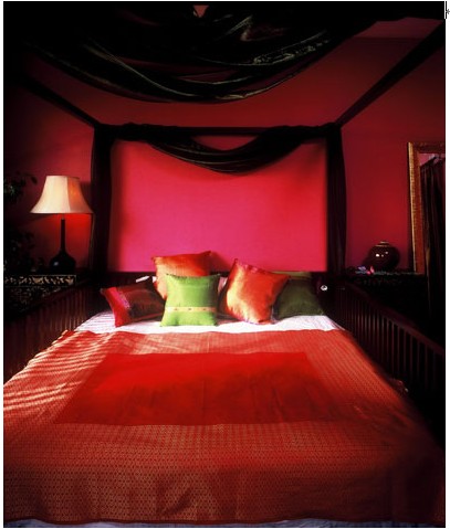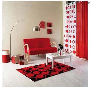 居室色彩搭配應考慮突出主色來進行裝飾,而不是考慮到某個突出的東西。圍繞主題色來進行色彩搭配,這樣搭配起來更精致,比較有韻味,更耐看。例如:鮮明的紅色背景墻面使人精神振奮,而紅色床品與背景墻面色彩呼應,黑色的幔簾和床架都與紅色完美搭配。所有的居家布藝色彩一定要和背景色主色基調(diào)相配。