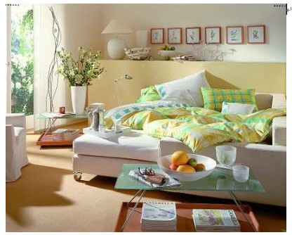 綠意濃濃的居室色彩搭配,綠與白的窗簾、靠枕色彩一致,大面積乳白色、暖黃色背景墻與沙發(fā)、布藝,共同營造了一個溫馨而暖意洋洋的居室空間。