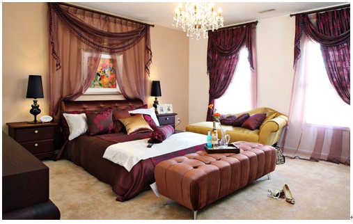 紫紅的色彩,精美的床頭裝飾與窗簾,配上精致的臺燈,使人一入臥室,便陶醉于浪漫的愛情氛圍之中。