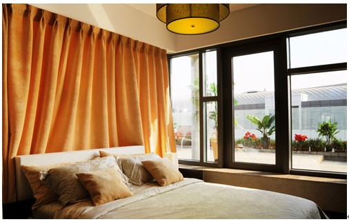 臥室床頭搭配了大面積橘紅色裝飾簾,打造出很好溫馨效果,而窗外綠色的植物讓盎然生機躍然眼前,使人在一覺醒來便可以感受到大自然的氣息,暖洋洋的陽光灑滿整個居室,帶來一整天的好心情從這里開始。