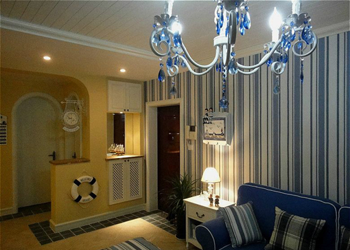 地中海的藍(lán)天白云在這里變成了藍(lán)白條壁紙及沙發(fā)軟墊,讓人在清新感之外又有一絲田園的感覺。玄關(guān)處掛著的裝飾救生圈又將我們拉回地中海的陽光下。溫馨墻壁色彩與地面的仿古磚相輝映,又出現(xiàn)了一絲古典的典雅。