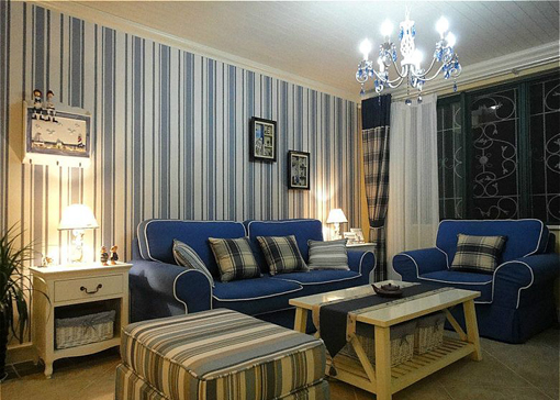 條紋壁紙與沙發(fā)軟墊在客廳里相互呼應(yīng)。茶幾小柜則又是簡約的田園型,色彩以溫馨為主,在滿滿藍(lán)天白條下為空間增加溫馨感。而藤制小框又是一個自由的收納體,可以不同地方進(jìn)行不同收納,可謂一物多用也。