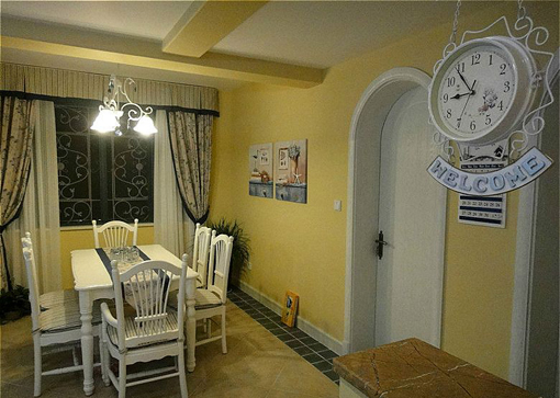 近景看餐廳吧。餐桌正對著一扇窗,簡約的鐵藝花紋既能增加居室的安全感又有美感,真可謂一舉多得??赐赀@個屋子有人會說這并不是純粹的地中海風(fēng)格,是的。小紡想說的是:無論哪種風(fēng)格,裝修自己的家,融入自己的需求才是最主要的,才是最合適的,才是自己的家。