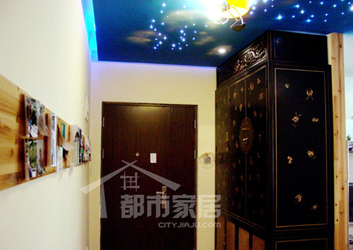 最獨(dú)特的要數(shù)天花板的處理了,藍(lán)藍(lán)的閃閃的,就像是晴朗的夜空一般迷人。設(shè)計(jì)師解釋說:“此處的效果實(shí)現(xiàn)方法其實(shí)很簡(jiǎn)單,先用普通的石膏板吊頂,然后在石膏板上做出很多直徑1厘米左右的小孔,最后在小孔內(nèi)部放置光纖就可以了。光纖的顏色可以隨意變換,星星點(diǎn)點(diǎn),神秘而浪漫?!?/FONT>