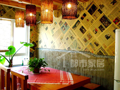 餐廳是一個(gè)尤其特別的空間,首先我們會(huì)被滿墻的英文報(bào)紙給吸引住,很奇特的裝飾手法!報(bào)紙整齊地斜鋪給空間帶來韻律感,圖文并茂又讓人不禁想要關(guān)注其中的故事,泛黃的顏色在這里營(yíng)造了一種懷舊的氛圍,這是整個(gè)餐廳最驚艷的一面。是壁紙嗎?設(shè)計(jì)師解釋道:“這其實(shí)是真正的報(bào)紙,是業(yè)主收集的關(guān)于某次事件所有報(bào)道的報(bào)紙,很有紀(jì)念意義。我們把報(bào)紙緊緊貼在墻上,然后在報(bào)紙上刷一層清漆,這樣報(bào)紙就完全被封在漆里,不會(huì)再變形變色了?!?/FONT>