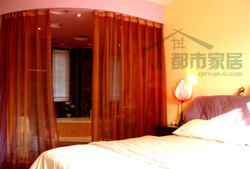 臥室里是一片暖暖的情調(diào),僅僅用紅色紗簾隔斷的開放式的衛(wèi)浴間蔓延著無邊的春色,看來這里是業(yè)主與戀人的甜蜜地帶哦。