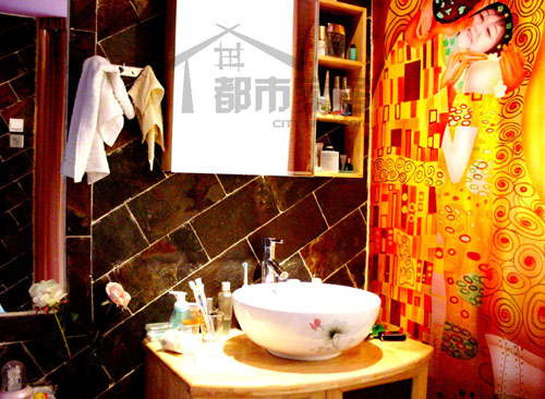最為讓人意外的畫面就在這里出現(xiàn)了!沒錯(cuò),就是這幅金燦燦的玻璃彩繪,猛一看有點(diǎn)詭異吧~至少小編是這么認(rèn)為的。設(shè)計(jì)師告訴我們:“其實(shí)這是一幅法國(guó)名畫《吻》,只是把畫中女人的臉換成了業(yè)主女友的臉?!迸叮瓉砣绱?,是名畫與真人的拼接啊,難怪有那么點(diǎn)詭異的效果,呵呵。