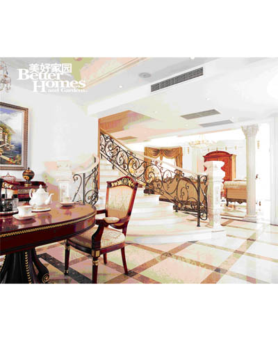 圖5:正常的樓梯踏步高度為16 厘米,設(shè)計(jì)師將其改為12 厘米,降低高度,拉寬踏步,以人為本的設(shè)計(jì),使用更加舒適。將樓梯整體延長(zhǎng),開端的喇叭口設(shè)計(jì)成就大氣尊貴的風(fēng)范。