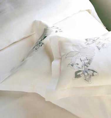 在枕頭和床單的邊緣有些鏤空處理,十字交叉,最基本的幾何圖案。這種效果看似簡單,其實工藝十分考究,它需要用上好的棉,因為纖維長,才不容易拉斷,同時接點的地方要處理得好,才能不出現(xiàn)線頭斷裂現(xiàn)象。